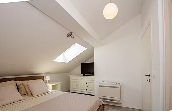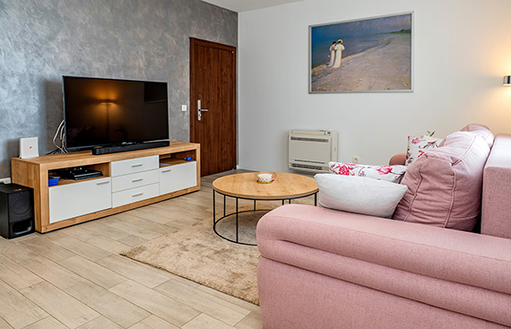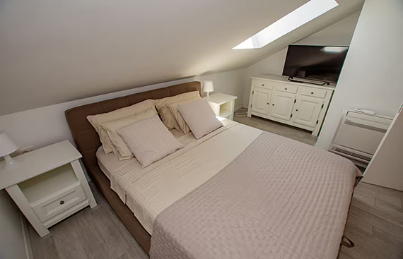 Apartament jest nowoczesny i w pełni wyposażony, aby zapewnić komfortowy i bezproblemowy pobyt. Obie sypialnie są klimatyzowane, co gwarantuje przyjemny pobyt nawet w najgorętsze dni lata. Jedna sypialnia posiada łóżko podwójne (160 x 200 cm), natomiast druga wyposażona jest w łóżko francuskie (140 x 200 cm). W salonie znajduje się również wygodna sofa, którą można rozłożyć do łóżka (160 x 200 cm) dla dwóch osób.