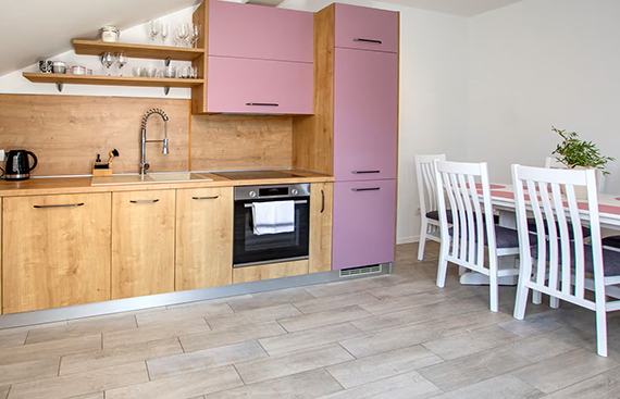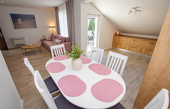 Szczególną zaletą jest zadaszony taras, idealny do relaksu i spędzania ciepłych letnich wieczorów. Apartament został urządzony z dużą dbałością o szczegóły i oferuje wysoki poziom komfortu, co czyni go idealnym wyborem również na dłuższe pobyty.